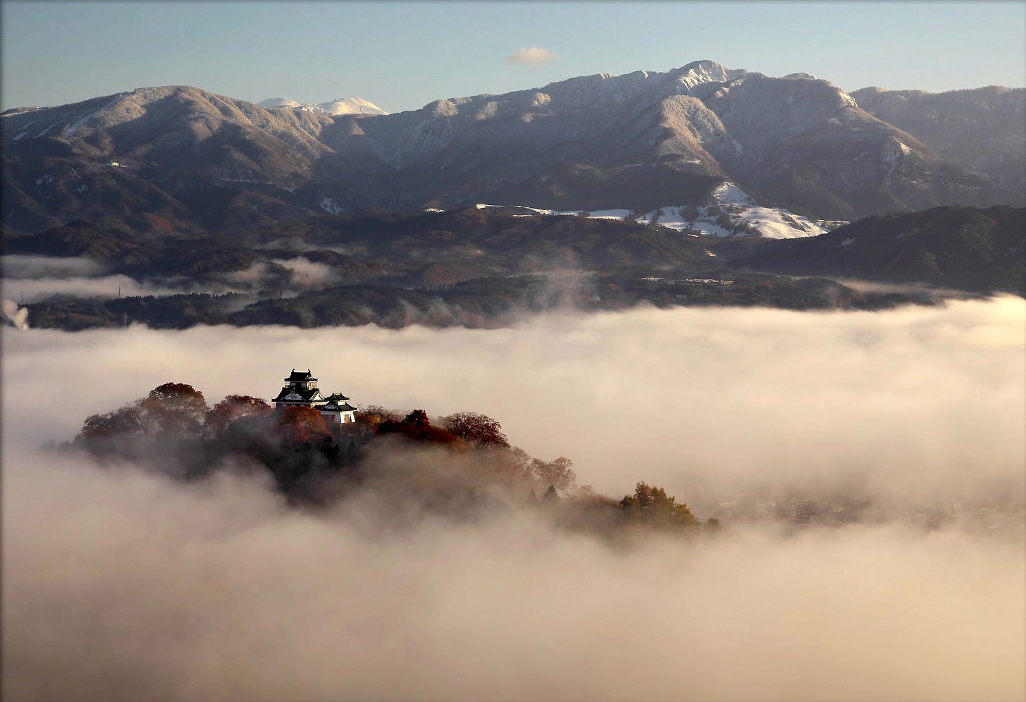 А потом вдруг на склоны гор, покрытых зелёными соснами, алыми клёнами и желтовато-оранжевыми гинкго, опустился белый покров. Все краски остались видны, но теперь они как будто просвечивали сквозь снег и туман.