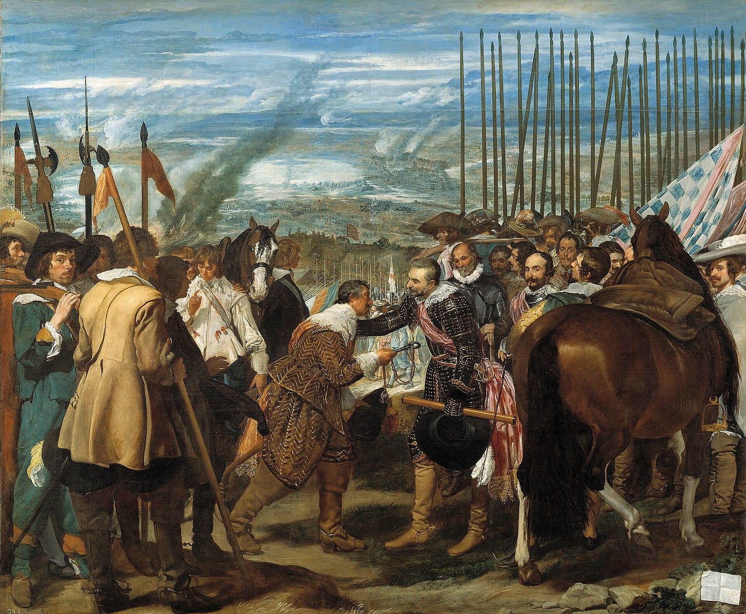 И Веласкес пишет картину, изображающую победу, произошедшую за десять лет до этого — когда капитулировала нидерландская крепость Бреда. Но его картина не про войну, не про торжество и не про великие победы испанского народа. Она — про милосердие, про тяжёлую участь людей на войне, про человеческое достоинство. В центре картины — губернатор Бреды, который передаёт ключи от города генуэзскому полководцу Амброзио Спиноле, который перед этим уже отдал приказ о том, что Бреда, одиннадцать месяцев мужественно сопротивлявшаяся, не будет разграблена, и её защитники уйдут спокойно. Вообще-то считается, что Веласкес «проиллюстрировал» слова из пьесы Кальдерона, тоже посвящённой взятию Бреды: «Достоинство побеждённого — слава победителя».