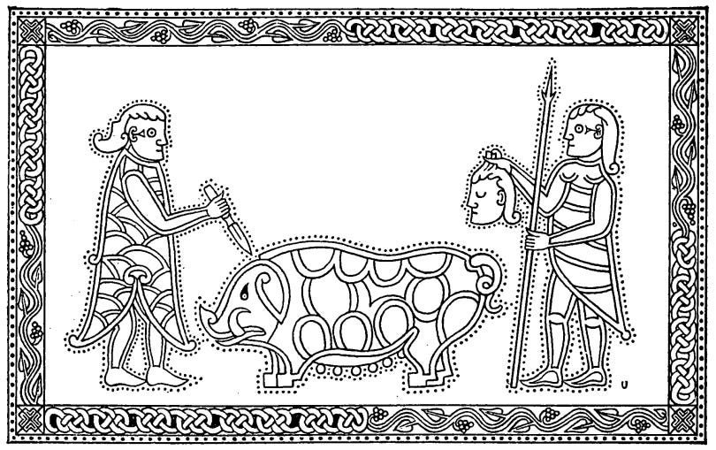 Бедный Мак-Дато понял, что дело плохо, и не знал, как ему выкрутиться из этой ситуации. Кому ни отдать пса, всё равно в другом наживёшь врага. И тогда по совету жены он сказал и тем и другим, что отдаст пса им, и предложил прийти в один и тот же день. А когда два могучих войска явились к Мак-Дато, тот сначала начал угощать их мясом свиньи. Свинья — очень почитаемое у ирландцев животное, связанное с древними верованиями. А эта свинья была совсем необычной. Семь лет её кормили молоком шестидесяти коров. И судя по тому, что вокруг неё было положено сорок быков, размера она тоже была необычного.