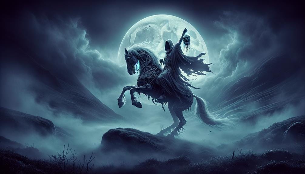 Это неприятное существо, которое называется дюллахан, появляется или на чёрном коне, или на чёрной повозке. Вместо кнута у него человеческий позвоночник, на повозке снаружи — черепа с горящими глазницами, спицы колёс — из костей, а сама повозка — из савана. А главное, голову свою он постоянно носит подмышкой. Вот такой милый товарищ. И если он остановился, значит, кого-то ждёт смерть.