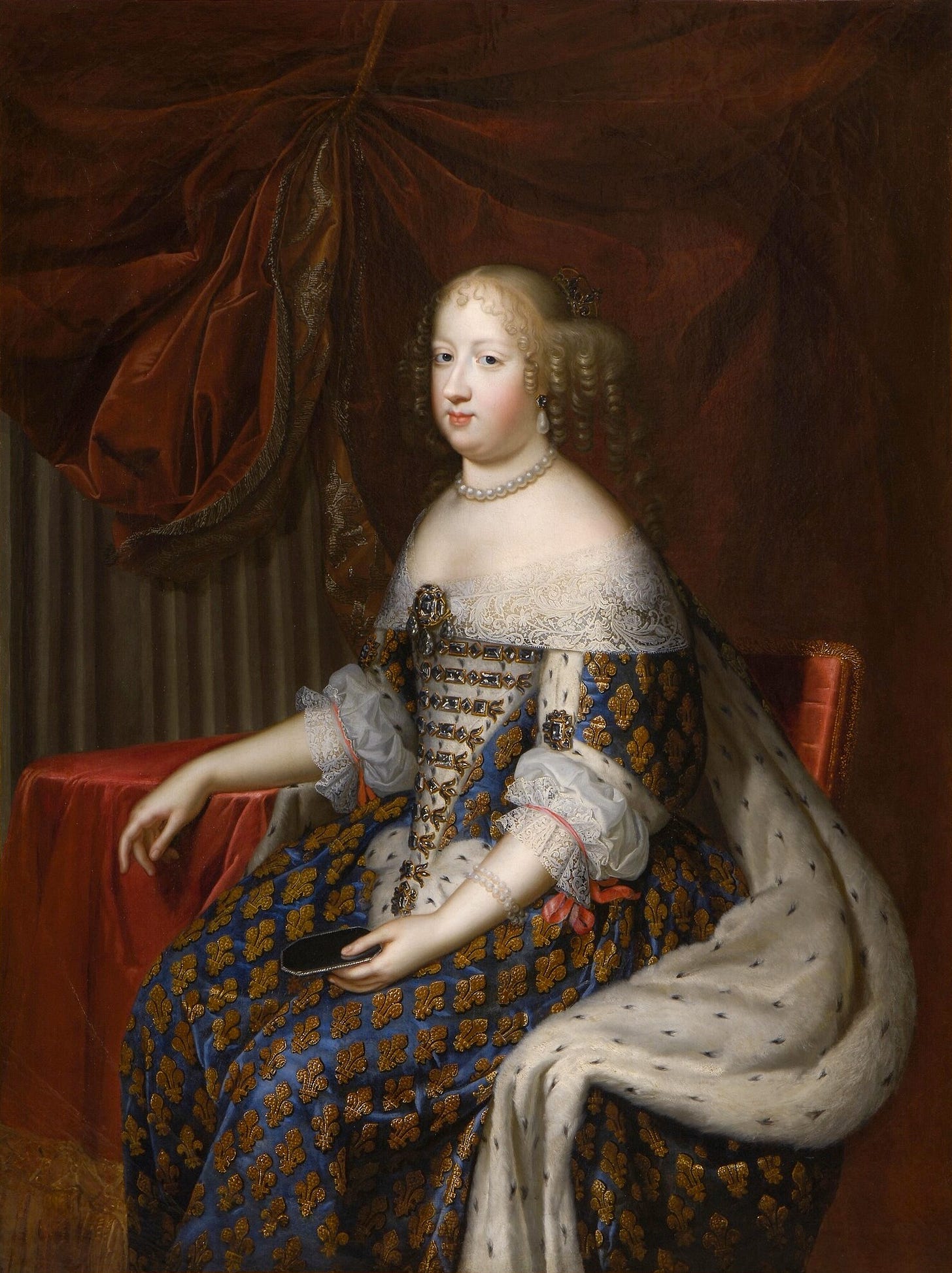Не так давно я узнала, почему у него так губы сжаты. Дело в том, что у Людовика под старость выпали все зубы — и ему приходилось глотать пищу, не разжевывая. А теперь, готовясь к онлайн-квизу о детях на престолах, я еще узнала, что в довольно молодом возрасте у него выпали почти все волосы — вот чем объясняются эти пышные парики.