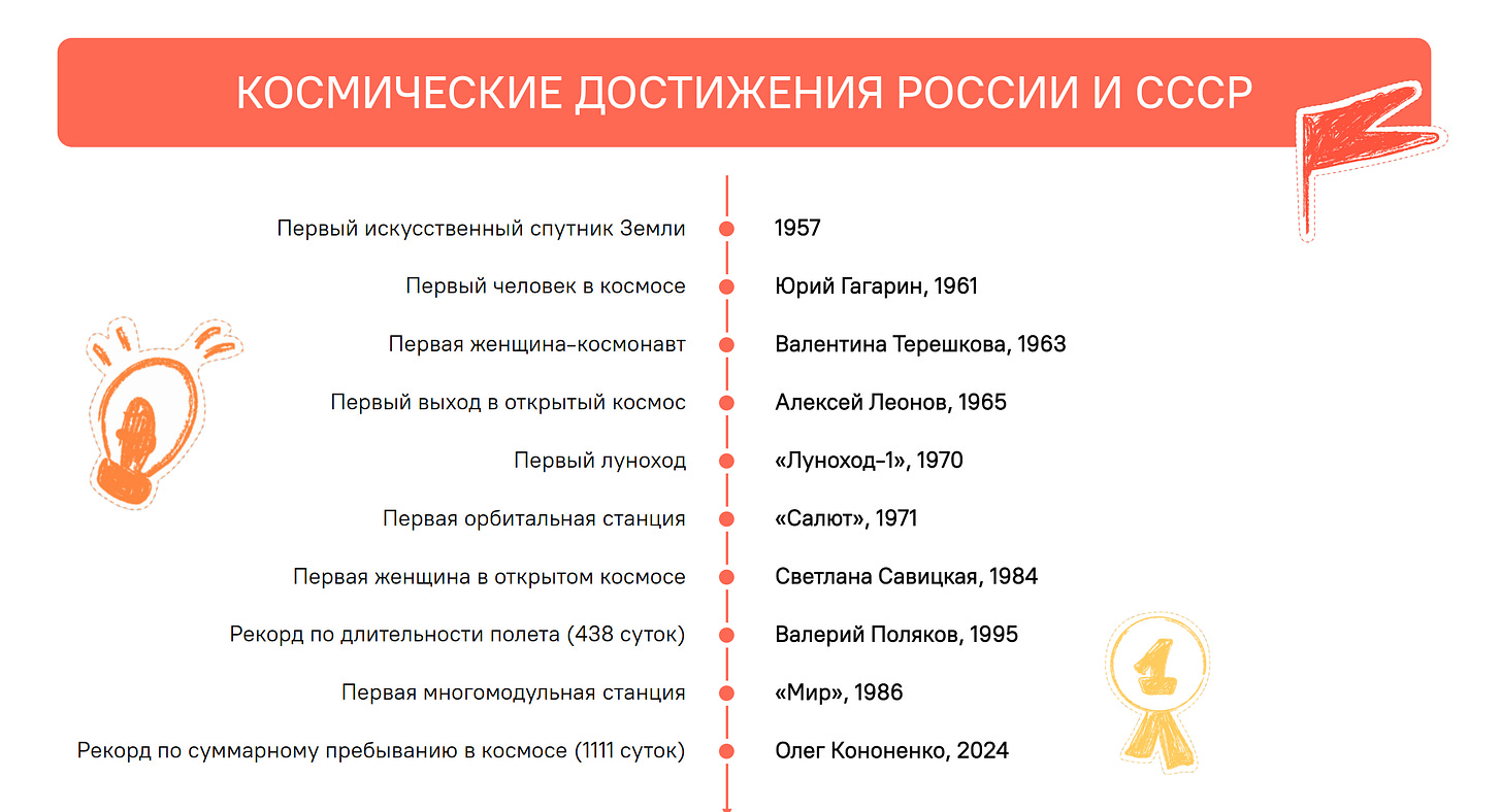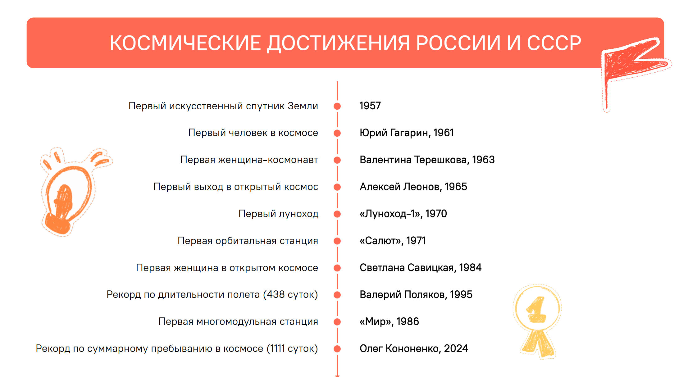 Есть там ещё слайд «Космические достижения России и СССР». Ох, какие же там отличные достижения: спутник, конечно же, полёт Гагарина, конечно же. Потом всё те же Терешкова и Леонов — первая женщина и первый выход в открытый космос. Потом — кхм — Луноход. За ними следуют первая орбитальная станция — «Салют». Первая женщина в открытом космосе — Светлана Савицкая. Самый длительный полёт — Валерий Поляков. Станция «Мир»… А после всех этих событий, заканчивающихся в 80-90-х, следующее (и, похоже, последнее) достижение — рекорд по суммарному пребыванию в космосе, установленный Олегом Кононенко в 2024 году.