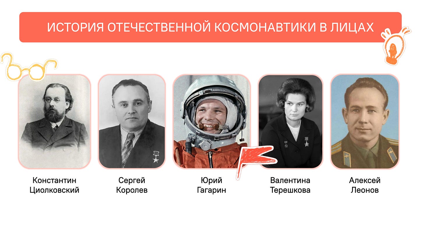 Ну да-да, конечно, Гагарин и всё такое прочее. Очень характерно, что в презентации, приготовленной для этого «Разговора», есть слайд «История отечественной космонавтики в лицах». Там есть портреты — первый, естественно, Циолковский. За ним следуют Королёв, Гагарин, Терешкова и Леонов. Точка. Всё.