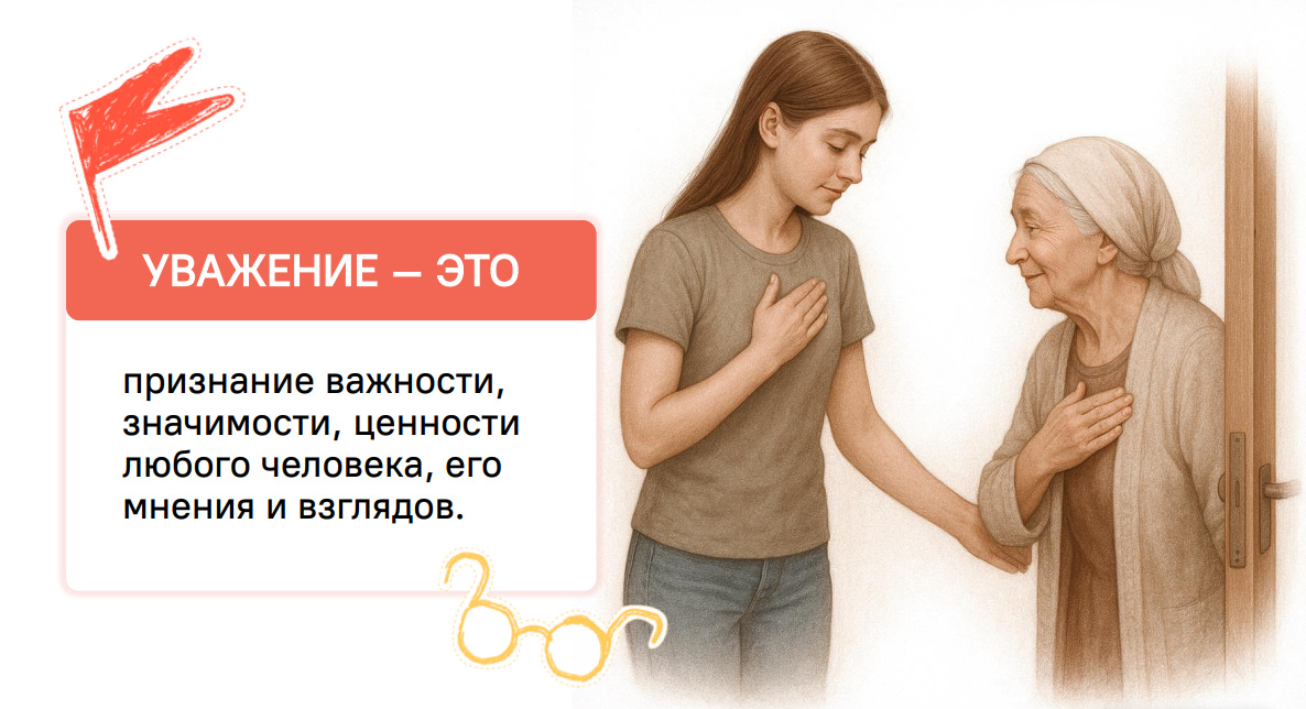 “Уважение — одно из важнейших требований нравственности. Оно предусматривает такое отношение к людям, при котором достоинство личности признаётся в действиях, мотивах, чувствах.”