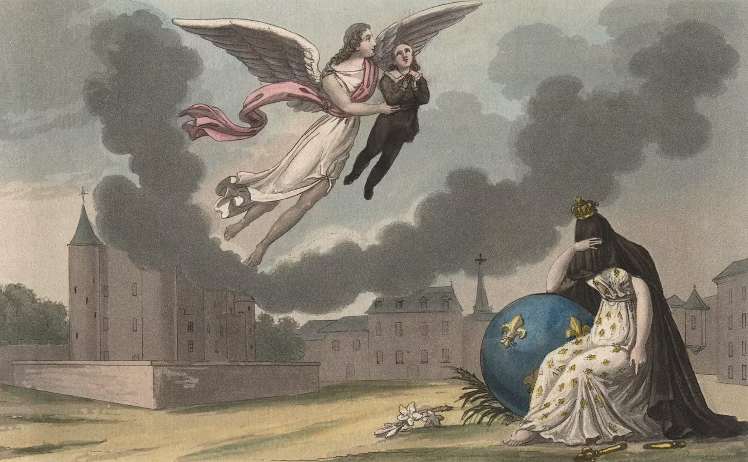 В башне Тампль королева, её дочь, сестра казнённого короля и верный камердинер Клери встали на колени перед маленьким дофином, приветствуя его как государя Людовика XVII.