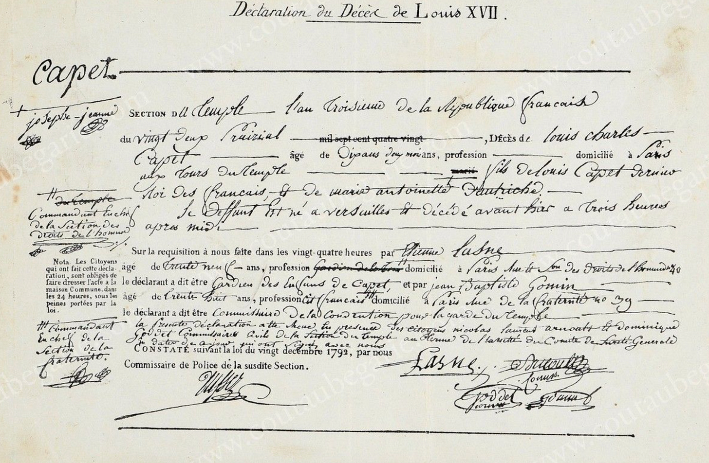 Тело погибшего в Тампле ребёнка было захоронено в глубокой тайне, так что возможности эксгумировать его и провести экспертизу нет. Зато фантастическим образом сохранилось сердце дофина. Проводивший вскрытие доктор Филипп-Жан Пеллетен тайно вынес его чуть ли не в кармане и долго хранил у себя в заспиртованном виде. Потом сердце переходило из рук в руки, пока наконец не было торжественно помещено в церкви Сен-Дени в Париже. В 1999 году в результате исследования ДНК этого сердца и сравнения его с ДНК родственников мальчика по материнской линии (у матери Марии-Антуанетты, великой австрийской императрицы Марии-Терезии, были чётки, в которых хранились волосы всех её 16 детей) был получен однозначный вывод: мучительно умирал в одиночной камере ребёнок, принадлежавший по материнской линии к династии Габсбургов.
