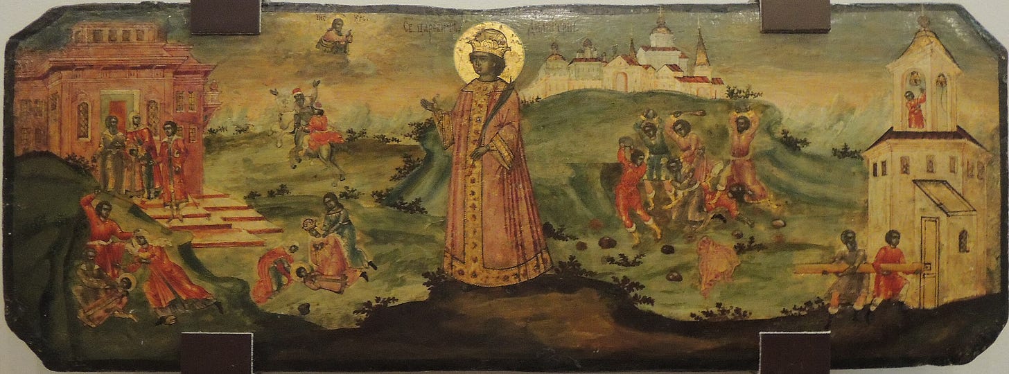 Убиенного царевича церковь признала святым, но тут возникла проблема. Если Дмитрий сам напоролся на ножик, то значит он — пусть невольный — но самоубийца и, следовательно, не может быть канонизирован.