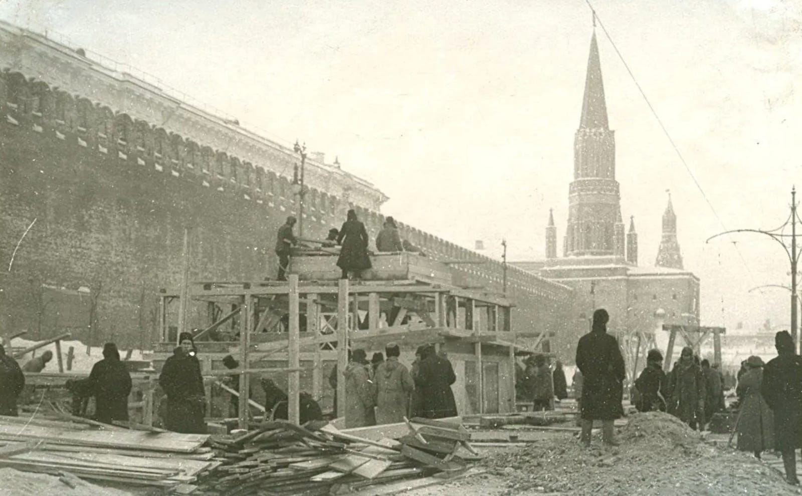 Необходимо было организовать доступ к телу для всех желающих, и так началось строительство гробницы. Сначала очень быстро, буквально за несколько невероятно холодных зимних дней, на Красной площади под руководством архитектора Щусева был сооружён временный деревянный мавзолей.