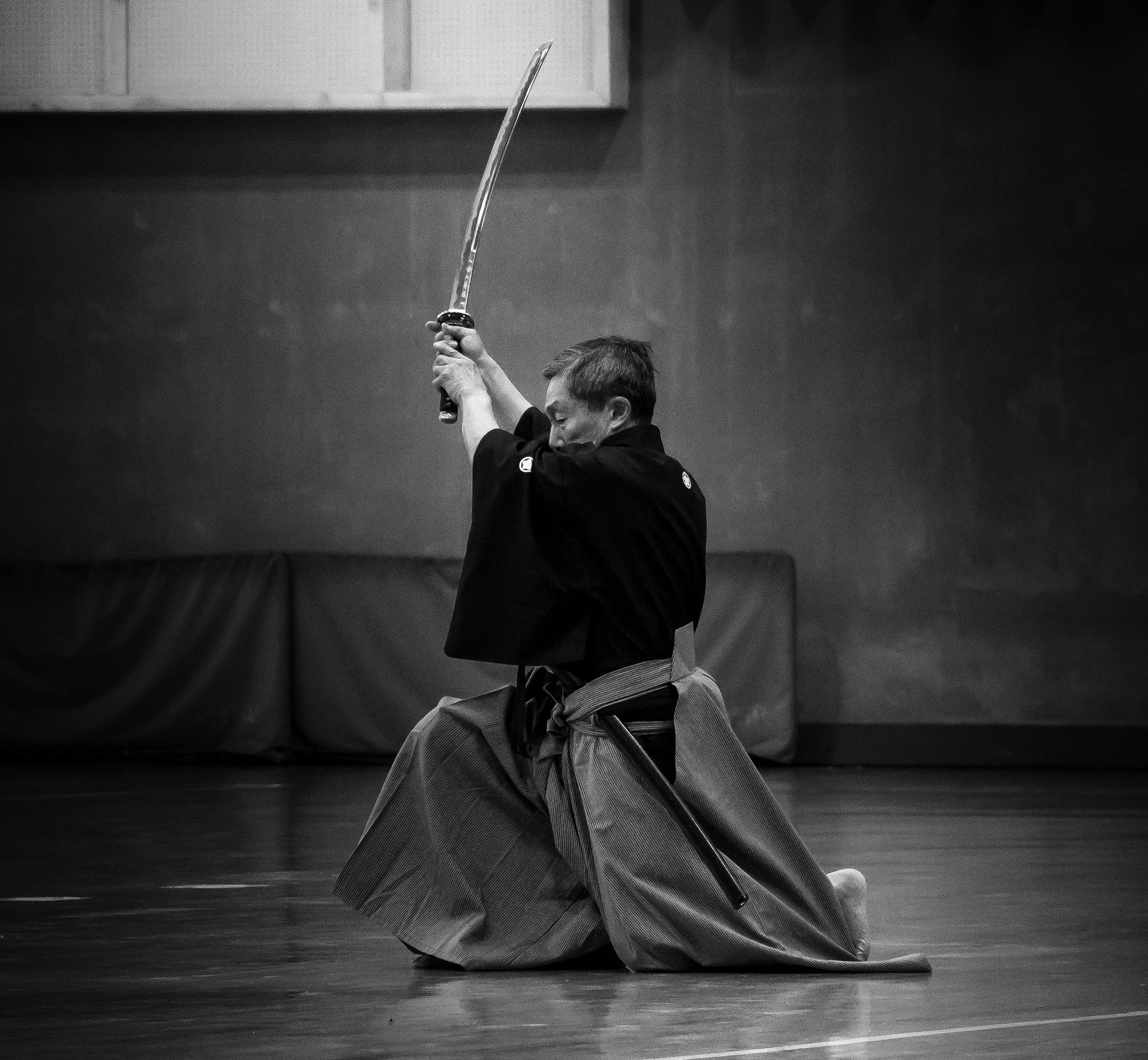 Прекрасный старенький сэнсей и два его помощника показывали нам, как вытаскивать меч из ножен, заносить его над головой, наносить удар воображаемому противнику.