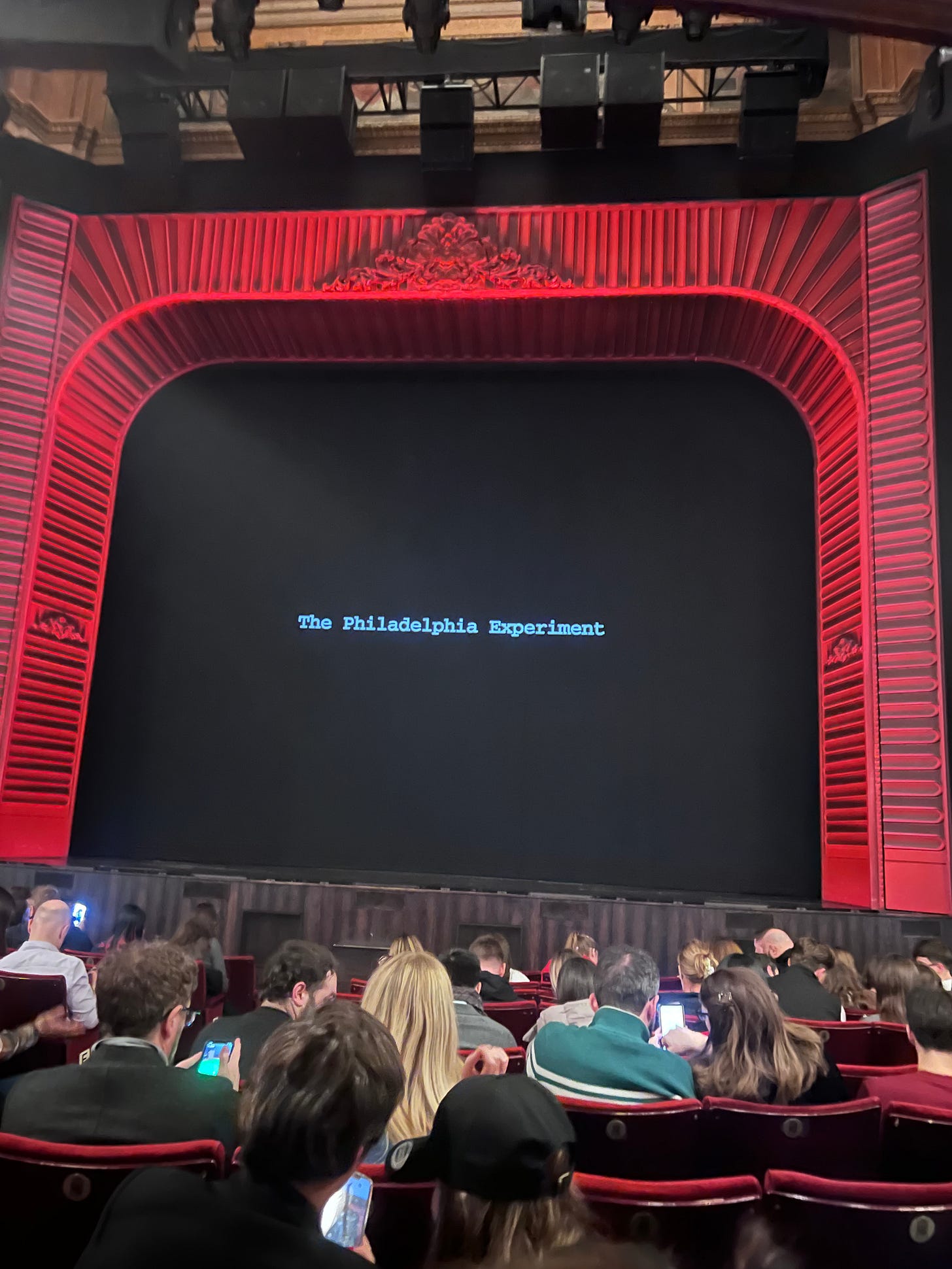 А дальше, когда двери распахиваются, перед нами на сцене возвышается огромный экран с надписью «Филадельфийский эксперимент» — отсылка к загадочным событиям 1943 года, когда якобы американские военные и ученые вышли в иное пространство и высвободили некие жуткие сверхъестественные силы. Собственно говоря, это одна из тех теорий заговора, от которых отталкивались братья Даффер, сочиняя концепцию «Очень странных дел».