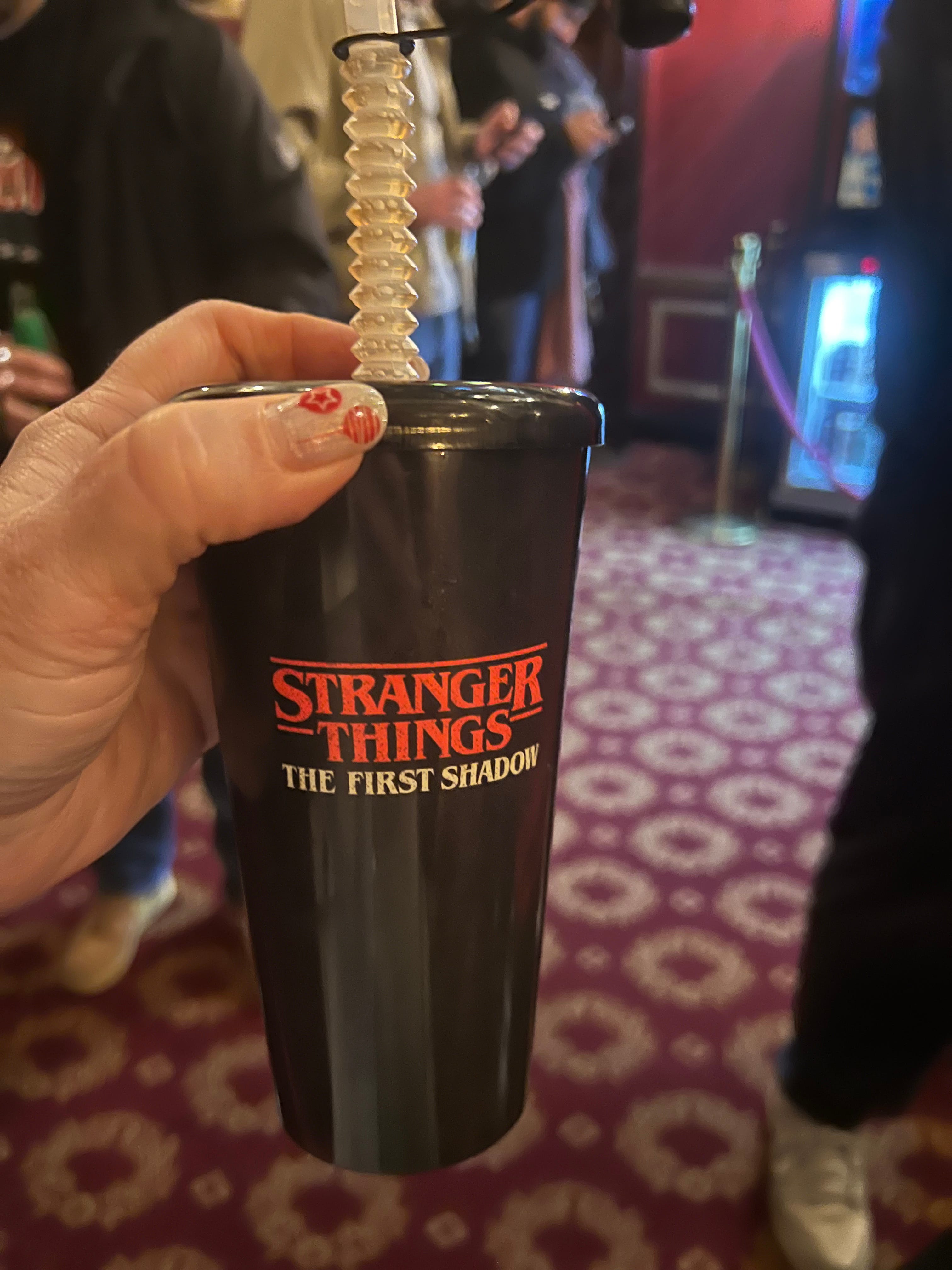 Ну что я могу сказать? Моему представлению о театре то, что я вчера увидела, не совсем соответствует. Но только не подумайте, что я браню этот спектакль. Просто это было что-то другое — может быть, иммерсивное шоу или классный аттракцион. Во всяком случае, как только ты входишь в театр, то, несмотря на его старинный интерьер, ковры и позолоту, тут же погружаешься в обстановку Хоукинса. На стенах — плакаты в духе 50-х годов, показывающие разных чудовищ или призывающие принять участие в постановке школьного мюзикла. В баре/буфете работает парень, чья прическа явно должна нам напоминать о Стиве Харрингтоне, а из-за закрытых дверей зала доносятся ооочень странные звуки.